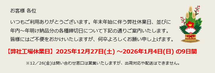 HOME > 新着情報 >   > 年末年始に伴うご注文締切日と出荷に関するお願い