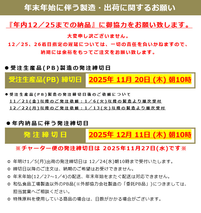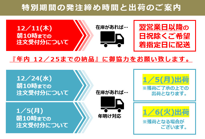 「年内12/25までの納品」「締切日時厳守」にてご発注をいただきますよう、