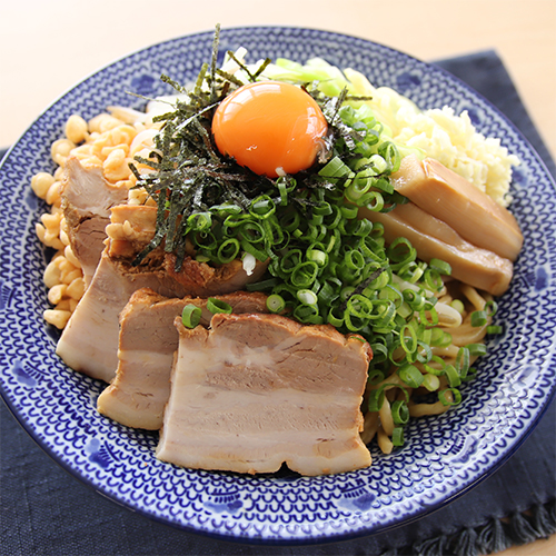 三種類の魚介のあら(北海道産真鱈のあら、鮭の中骨、焼いた鯛の頭)でとった出汁と濃厚な豚骨の味わいの魚介まぜそばです。分厚いチャーシューや刻みニンニクをたっぷり加え、食べ応えのあるジャンク系に仕上げました。